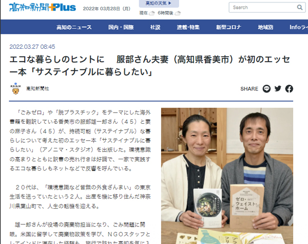 3/27の高知新聞社会面、服部雄一郎さん・服部麻子さんのインタビューにて『サステイナブルに暮らしたい』『ゼロ・ウェイスト・ホーム』をご紹介いただきました
