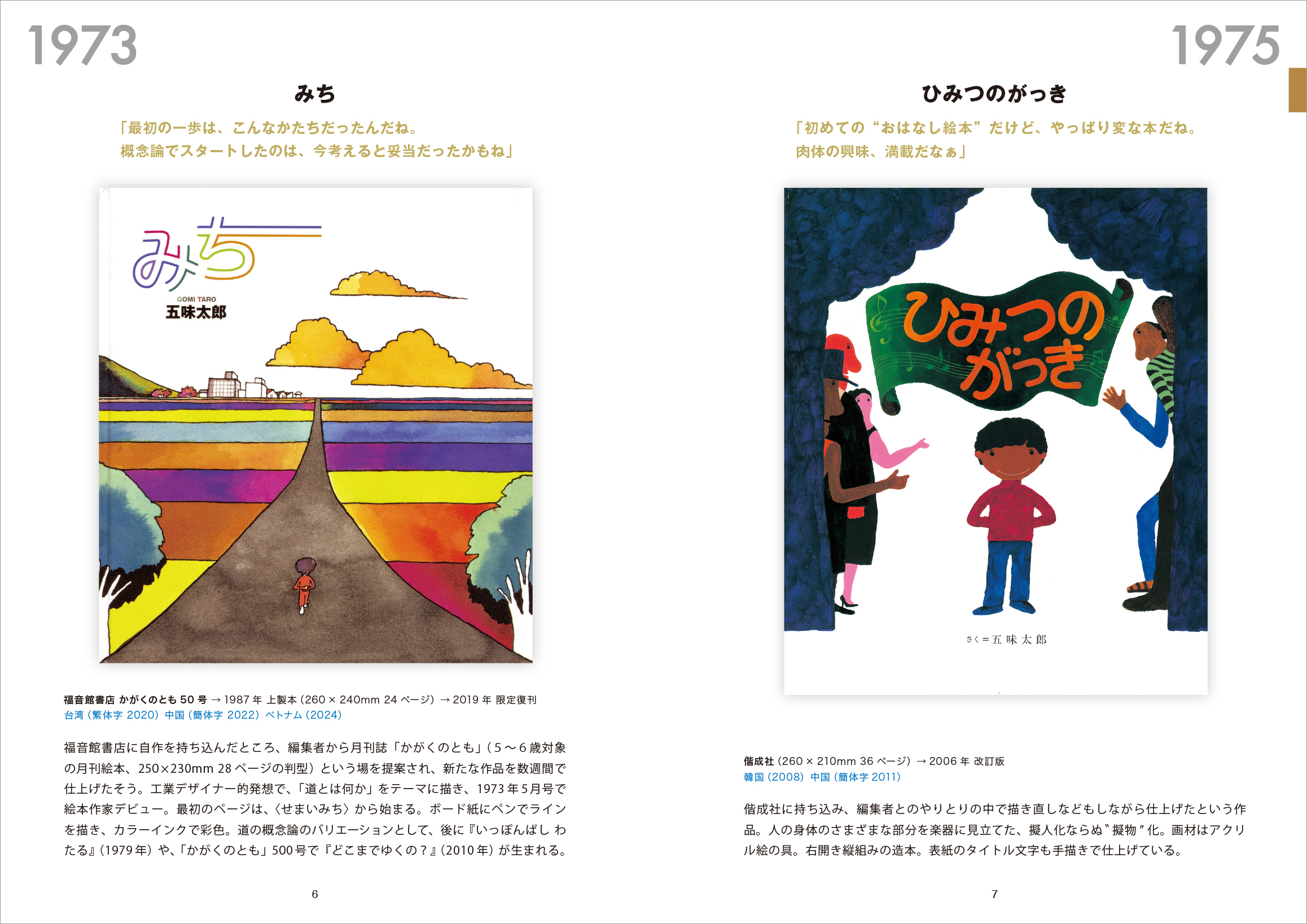 「すべてのことが絵本になる」と明言される絵本作家・五味太郎さん。その全著作を刊行年順に紹介する出版年代記(クロニクル)です。1973年の『みち』から、その数は全372冊!作家自身へのインタビューをもとに一冊ずつ紹介し、ミリオンセラー、ロングセラー、シリーズ本からアート本まで、作品が生まれた背景や気分、創作の種を感じることができます。本文の間には中面をコラージュしたビジュアルページがあり、作風の変遷と実験の足跡を辿ることも。巻末の作家生活52年間を振り返るインタビューからは、精力的に新作を生み出し続けるクリエイティブの源泉が伝わります。絵本作家・五味太郎を知るための、完全保存版となる一冊です。