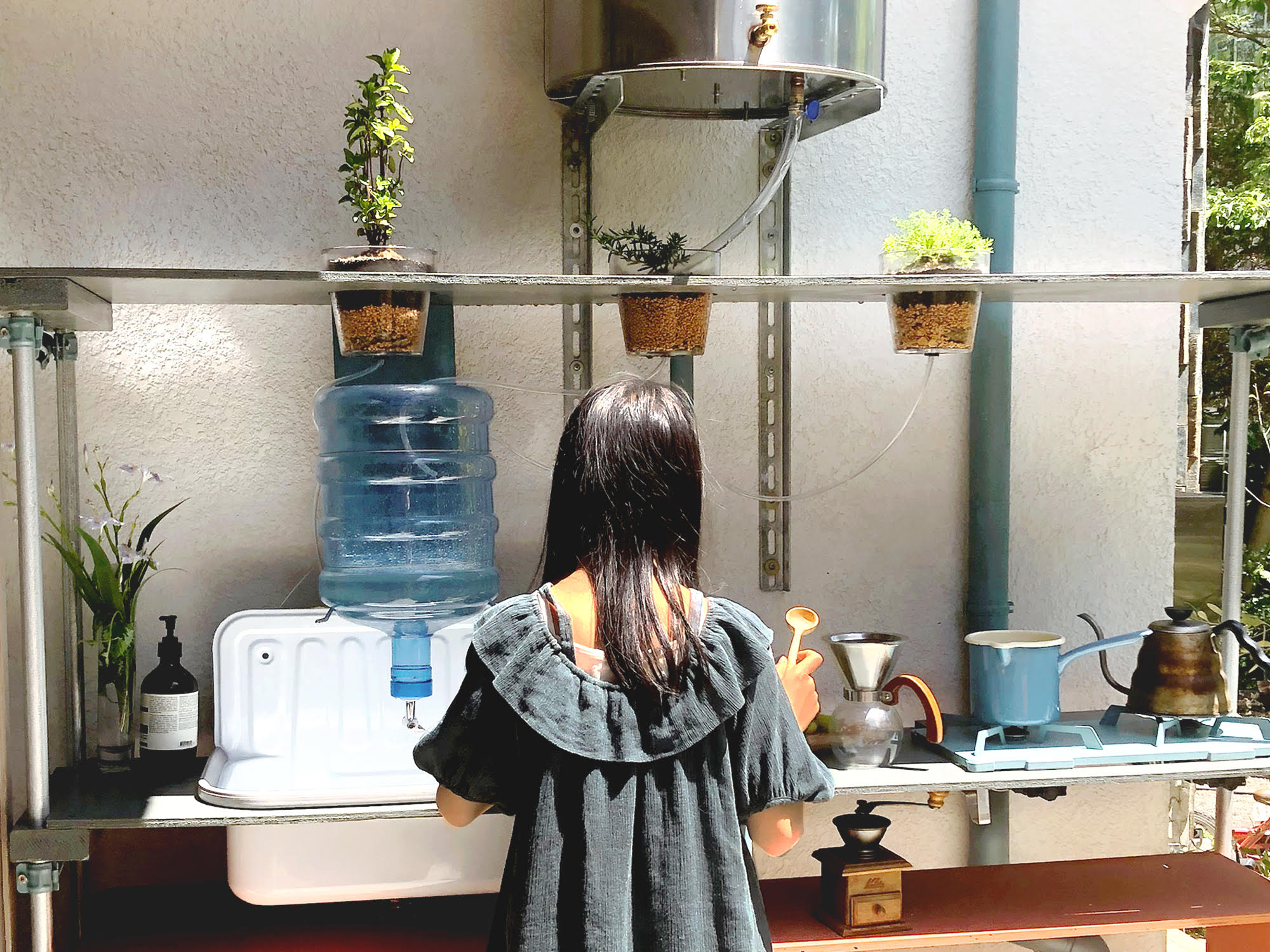 7歳の時から「サンデーカタネコーヒー」として日曜の朝にコーヒーを淹れている娘専用の野外キッチンを制作。とあるCMで使ったコンロやパイプなどを材料に、野外に作るからには雨水タンクに貯めた水を植物とゼオライトを通して濾過する循環型キッチンに挑戦。これは濾過できて…いるのか?!最後にはシャワーヘッドから植物の水やりもできます。