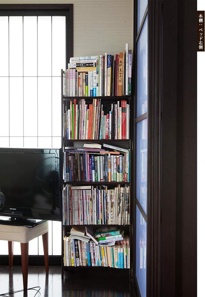 そんなダメダメな前段階を踏みつつ、取材当日、恐る恐る京都入りして目にしたバッキーさんの本棚は、寝室のベッド脇に二手に分かれて置いてあった。拝読する筆の感じから大層な本棚を想像していたが、これまた拍子抜けするほどいい意味で細身でライトな本棚。しっかり背の高さに合わせて美しくというのとは正反対に、ここは私の理想通り、ぶっきらぼうに毛色の違った本がザクザクと差し込まれていた。思っていた以上に本の数が少ないことに驚いていると、察したのか「僕はね、本屋に行ってぽろっと買ったり、新聞の書評を見て読んでみようかなと思ったものとかを買うんだけど、読んでおもしろかったら人にあげるんよ。自分が読んでいていいなと思ったら、これ、あいつにも読んでほしいなと思うやん」とぽそり。そして「だからここにあるのは人にあげてもおもろないものか、どうしても手放したくないもののどちらか」と続いた。なるほど、そのどちらかとはどんなものなんだろう?と、本棚に近づいてみると、『談志絶唱 昭和の歌謡曲』『世間はやかん』『童謡咄』など、立川談志師匠の著書が結構ある。ほかにも『常用字解』『日本の名随筆 将棋』、山口百恵が表紙の雑誌『GORO』は、昭和52年のもので、山口百恵と矢沢永吉の特集だった。松坂慶子の写真集も目立っている。これはどうしても手放したくないもの、だろうか?