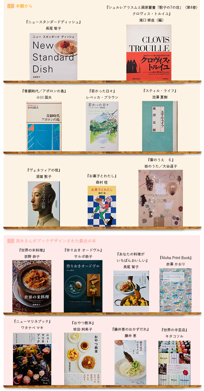 茂木さんがデザイナーとして活躍しているのは、エディトリアルの世界のなかでも特に料理に関する本が多い。料理本の奥付を見ると、結構な確率で彼の名を目にする。そんな彼が学生時代から好きだったというハギワラトシコさんの『ワンダフルパーティーズ』や、フリーのデザイナーになったばかりの頃に手にした長尾智子さんの『New Standard Dish』などは、私も大好きな名著だ。ハギワラさんのこの本は、あまりに好きすぎて、見つけては購入して友人たちにプレゼントしているのだそう。私もずいぶん昔に、ちゃっかりおねだりしてプレゼントしていただきました。あとは、小川国夫さん、須賀敦子さん、池澤夏樹さん、レベッカ・ブラウンとお気に入りの本が挙げられた。北九州市の広報誌の巻頭におさめられた大谷道子さんのエッセイなども。静かに一冊ずつ頭の中の深いところからそおっと思い出を引き出すように言葉を選びながら、いつの時代に読んでいた本なのか、なぜ、これらを選んだのか、何冊も著書がある作家さんに対しては、なかでもこの一冊が好きな理由も添え、小学校から現代に至るまで生い立ちを辿るように、話してくれた。川の流れの中にいるかのような静かな時間—全体にわたってそんな時間だったけれど、特にここはシューッと静かに物語の幕が閉じるような、ぱたんと最後本の裏表紙を閉じたかのような、そんな話の締めくくり方だった。何度巻き戻してももう二度と音が出なくなってしまったテープレコーダーのような、もしくはレコード針がレコードの上でパチパチと小さな音だけ立てているかのような、無の世界。でも色をつけるとしたら、乳白色のあたたかな白。冷たくはない。「はい、これでおしまい」と言われたけれど、あたたかな光がずーっとあり続けるような雰囲気にのまれ、なんだか泣きそうになっていた。こんな一面があったなんてね。茂木さんが友人としても、仕事仲間としても見せる、あたたかな一面はこんな空気とつながっていたんだなぁ。